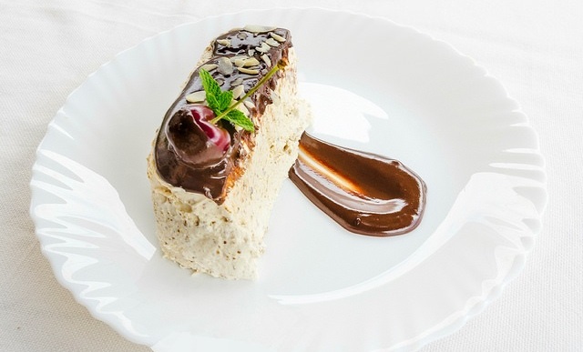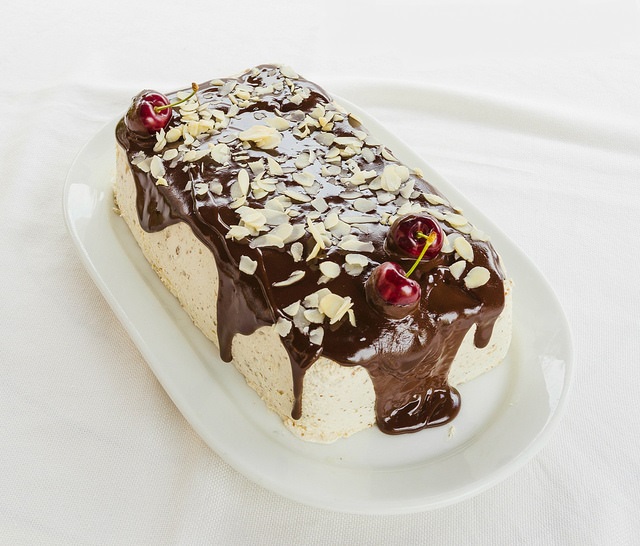 Sacamos el biscuit del congelador y lo presentamos en la bandeja de servir, lo cubrimos con la salsa de chocolate caliente y lo decoramos con unas cerezas y las láminas de almendras.