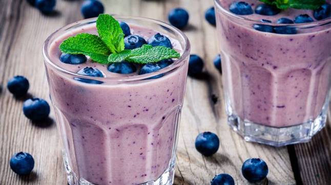 - Vierte el smoothie en cuatro vasos altos y sácalos a la mesa sobre unos platos adornados con unos arándanos y con una pajita en su interior.