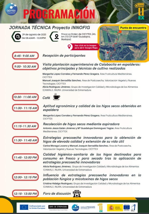 El proyecto INNOFIG, financiado por la Agencia Estatal de Investigación (AEI), es un proyecto coordinado por el Centro de Investigaciones Científicas y Tecnológicas de Extremadura (CICYTEX) junto con la Universidad de Extremadura (UEx). El trabajo se centra en la obtención de higos de la variedad Calabacita, cultivados en sistemas superintensivos, con una elevada calidad nutricional, bioactiva e higiénico-sanitaria, tanto para consumo en fresco como en seco, mediante la aplicación de estrategias innovadoras basadas en el uso de bioestimulantes en precosecha.