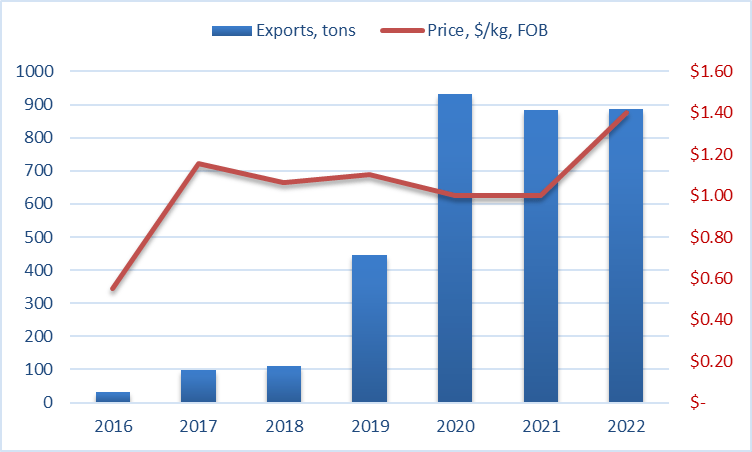 En los dos primeros meses de la temporada activa de 2023, Georgia exportó 205 toneladas de higos, un 25% más que el año pasado. Los precios de exportación en términos FOB se han reducido de 1,40 $/kg en la temporada anterior a 1,30 $/kg en la actual. Aún así, el precio de exportación en 2023 es el segundo más alto. Debido al gran aumento del volumen de exportación, los ingresos globales de la temporada en curso son superiores a los de la temporada récord de 2022. En lo que va de temporada, los ingresos de las exportaciones constituyeron 255 mil dólares, lo que supone un crecimiento anual del 13%.