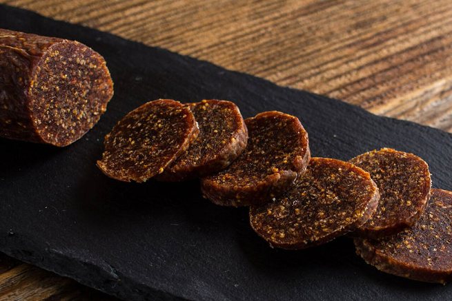 -Si sigue una dieta vegetariana, puede sustituir fácilmente los salamis de carne por el salami de higo y acompañarlos con galletas, frutos secos y fruta deshidratada.